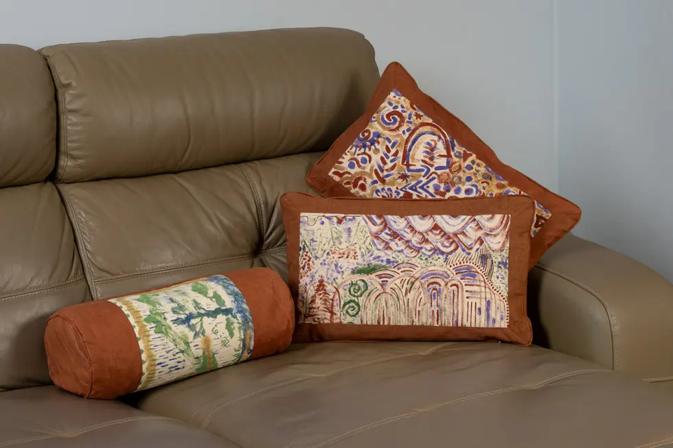Yujin Lee's "Painting Conversation: Stories of Rice-Thieves" cushion series is a unique reinterpretation of her collaborative art practice. Exclusively available at Iron Velvet Art, each cushion features 18 original paintings made with natural paint on linen. They are adorned with traditional Jeju fabric dyed with persimmon, filled with cotton, and sewn by a Dongmun Market seamstress. Each piece reflects the stories of the participating artists.